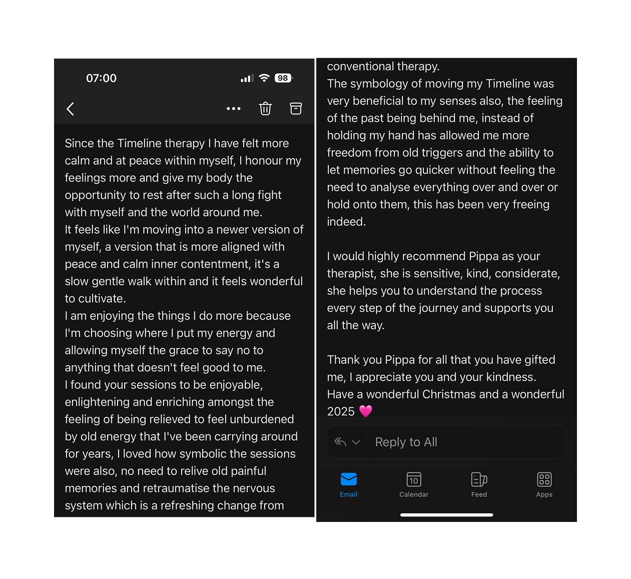 To further support me in dealing with the backlog of old emotional baggage, pippa has offered me the opportunity to embark on Timeline therapy, to be able to release the excess old energies, thus creating more space internally to melt into the Peacefulness I am cultivating with the help of the tools Pippa has gifted.