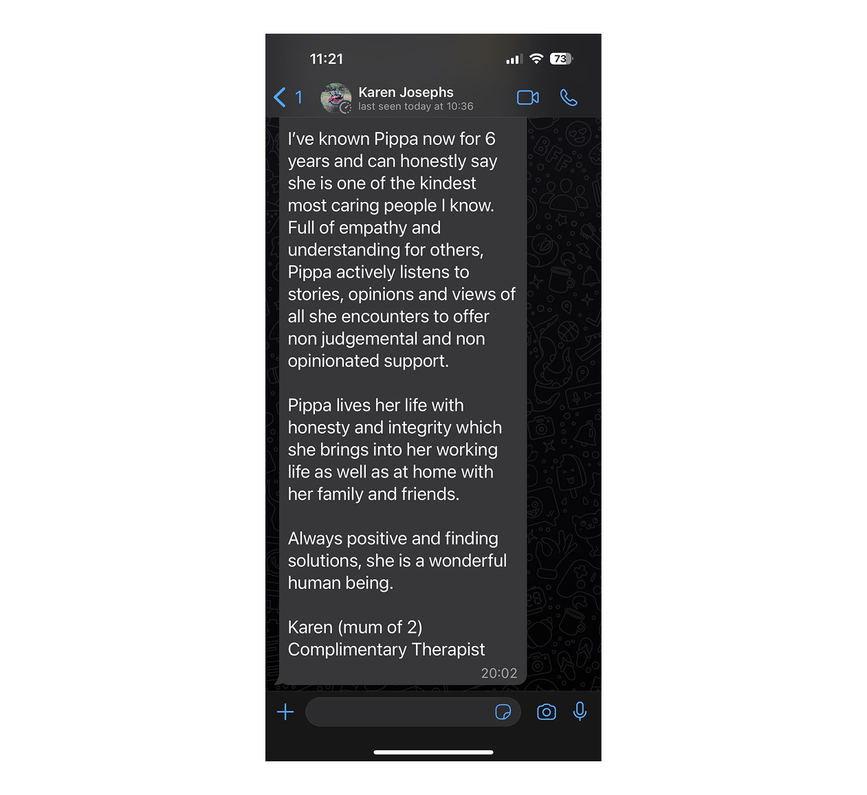 Pippa is a beautiful person, she is kind, patient, caring and sincere and I felt at ease with her immediately, trusting people hasn’t always been an easy journey for me, but when you meet the right people, divinely sent to support you, trusting them is easy.