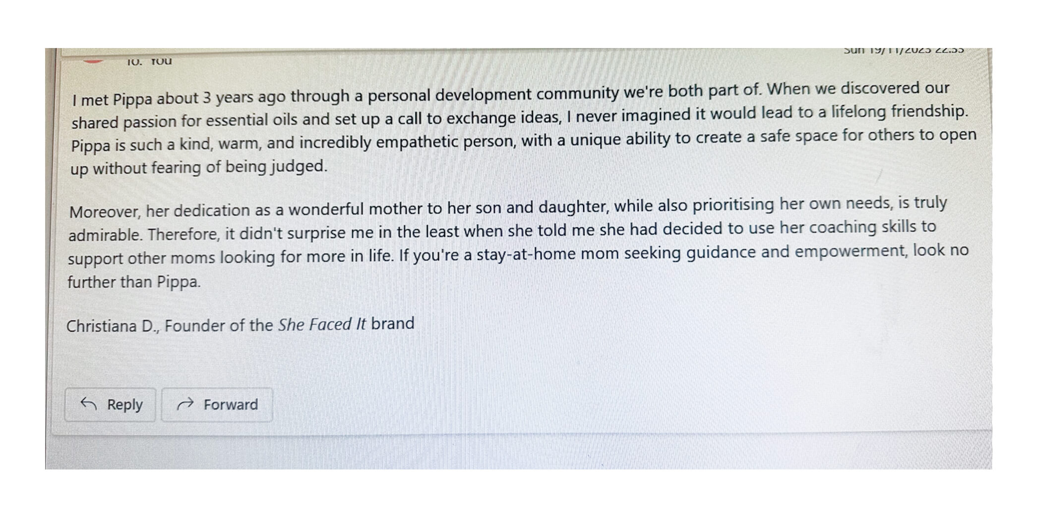 One of the most impactful exercises Pippa introduced allowed me to identify areas in my life that needed attention while also recognizing those for which I could express gratitude. This balanced perspective was eye-opening. The tasks Pippa assigned were engaging and insightful, with one particular exercise profoundly improving my relationship with my husband. It helped me shed resentment and view our dynamic differently, which has had a lasting positive impact on our marriage.